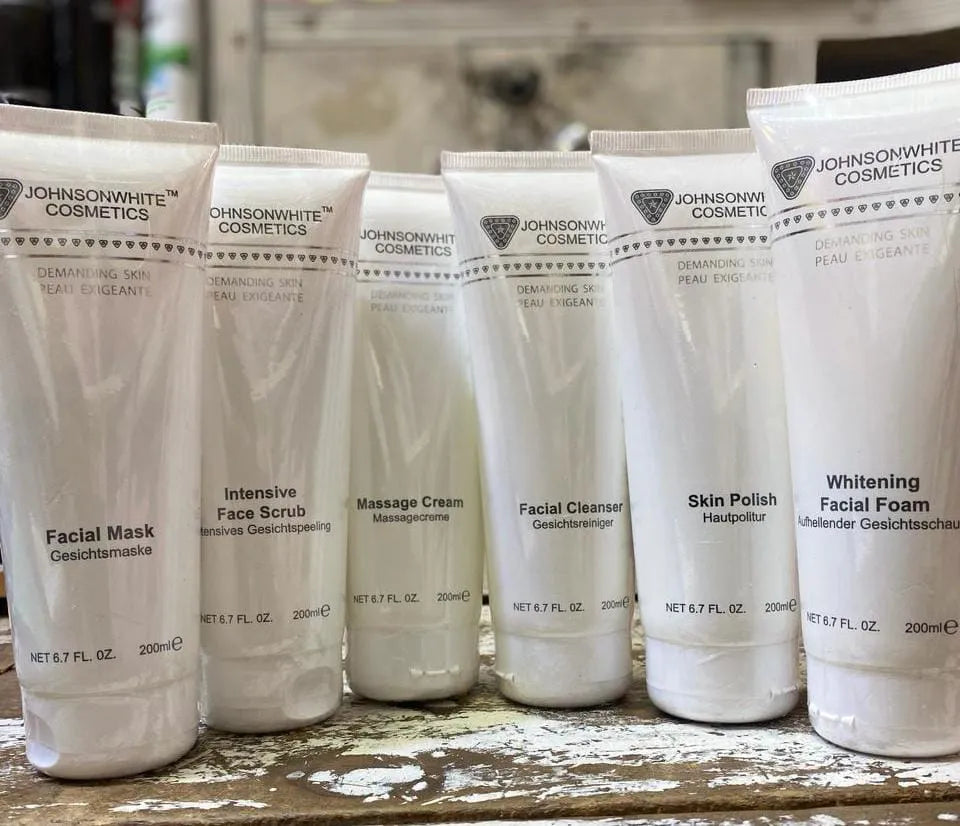 The Johnson Whitening Facial Kit 5pcs Set, designed for all skin types. This comprehensive set includes five 200ml tubes, offering a complete facial care solution. The kit is ideal for those seeking a radiant and even skin tone. With its focus on whitening, this product is perfect for individuals looking to brighten their complexion and achieve a healthy glow. Whether used as part of a daily skincare routine or for special occasions, this facial kit provides a luxurious and effective solution for facial cleansing.